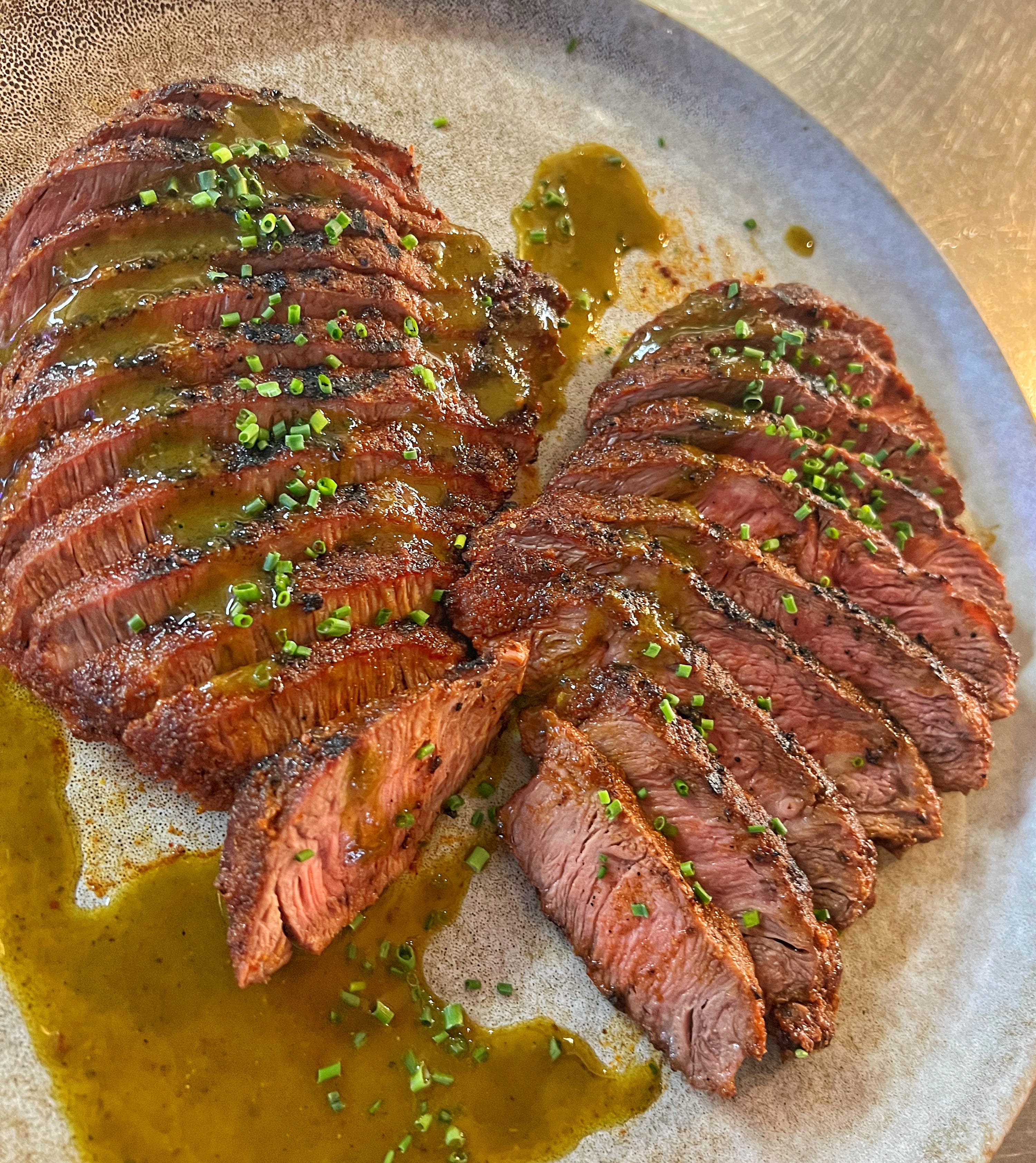 For this test, I used two flat iron steaks. I toss them with a touch of salt, then cover them with the rub. I allow them to sit for about 5-10 minutes, then place on a sheet pan and bake in a 375F oven for 8-10 minutes. At this point, I pull them from the oven, drizzle with melted butter or avocado oil, and grill on both sides. Let it rest, and slice the meat. You won’t be disappointed. If you are, just insult me in the comment section.