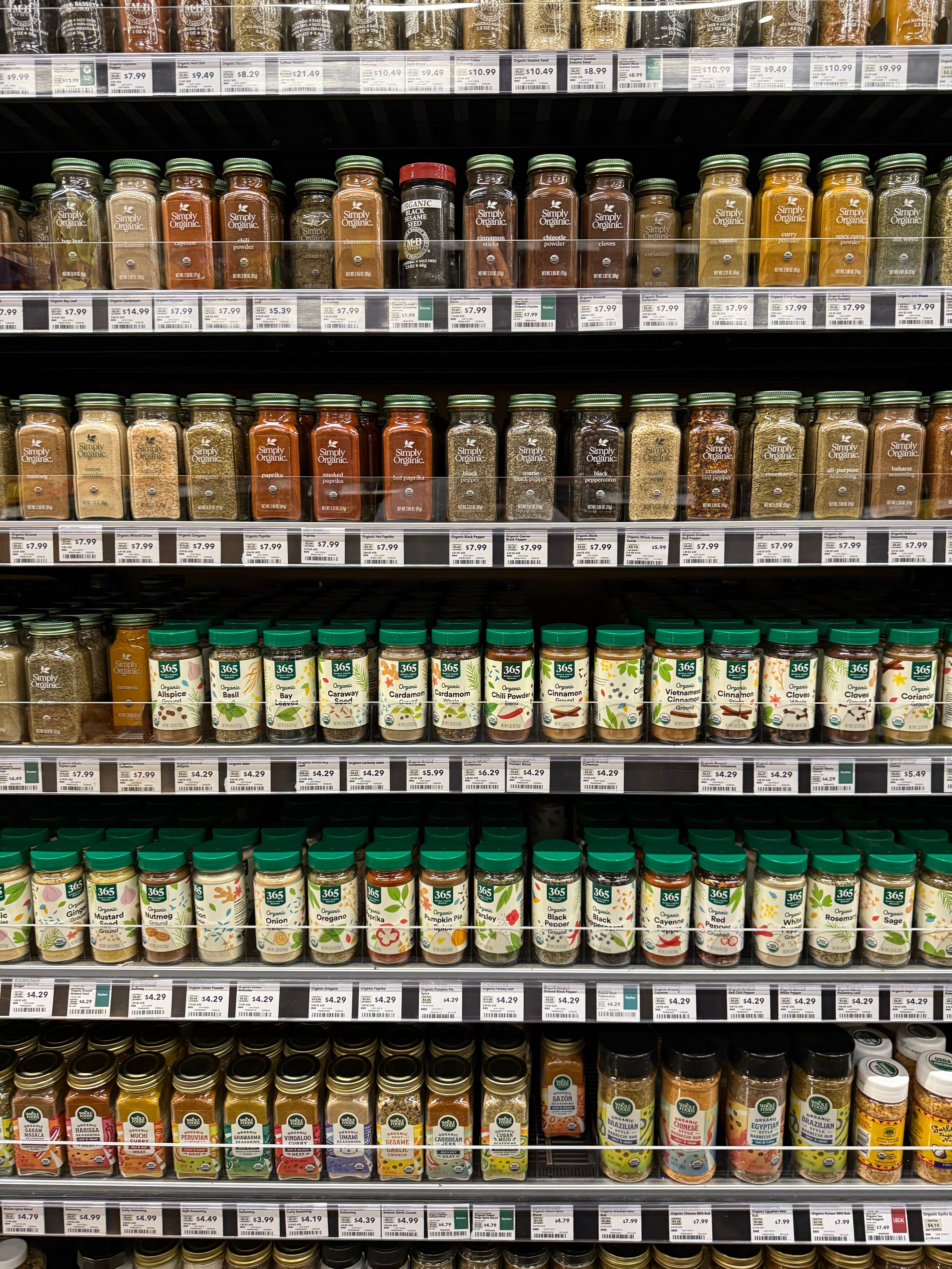 I never buy an entire jar of spices off the rack anymore--we go through phases where we love one type of cuisine, and then don't revisit it for years sometimes. And they're so expensive! So I just got some generic spice jars and write on them with sharpies, get a small quantity of spices from the bulk section for just a few cents, and rotate the lesser-used ones out and wipe the lids off with a magic eraser for something new later. No more stale spices taking up valuable cabinet space! Of course, we always have the basics--thyme, rosemary, basil, marjoram, cumin, coriander, pepper flakes, two kinds of paprika, dill, mustard seed, cinnamon, nutmeg, cloves, garlic/onion powder and granules, black and white pepper, and garam masala. We also are weird, so we like to have herbes de provence and a good poultry blend in jars that are easily accessible and restocked regularly.